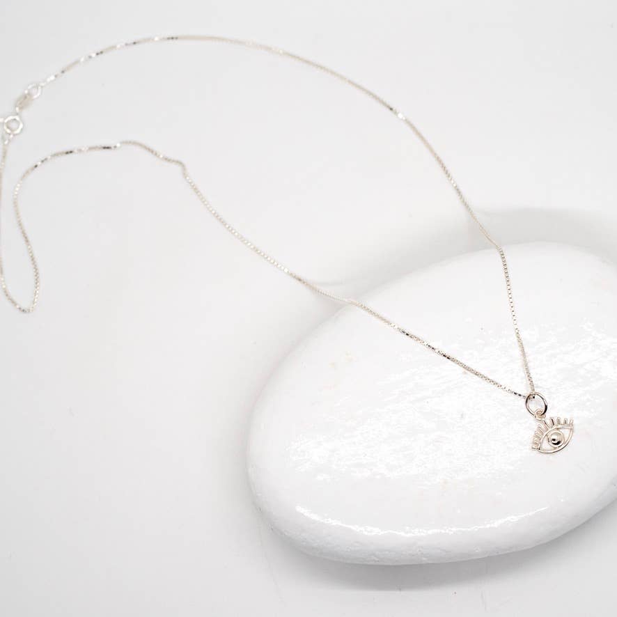 Sterling silver necklace with delicate evil eye pendant. Chain measures 18 inches.